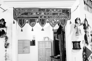 This photograph captures a vibrant textile hanging gracefully above a doorway, intricately embroidered with symbolic motifs. Surrounding it are various cultural artifacts, suggesting a rich narrative of heritage and craftsmanship. The black-and-white tone evokes a nostalgic mood, inviting viewers to reflect on the beauty of tradition and memory.
