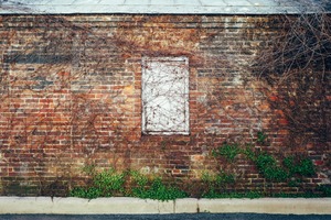 This photograph captures the rustic charm of a brick wall partially hidden by climbing vines and foliage. The interplay of warm brick tones and earthy greens creates a tranquil, nostalgic mood, evoking themes of nature reclaiming manmade structures. Soft, natural light illuminates the scene, enhancing the textures of the bricks and the delicate patterns of the vines.