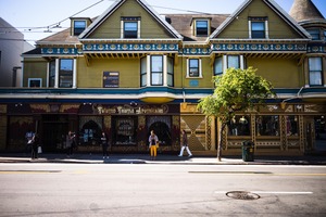 This photograph captures a vibrant streetscape featuring a striking yellow Victorian building accented by intricate trim. The mood is lively, with pedestrians in casual attire, bathed in bright sunlight, suggesting a warm day. The composition balances architectural details with the dynamic movement of city life, highlighting the unique charm of the locale.