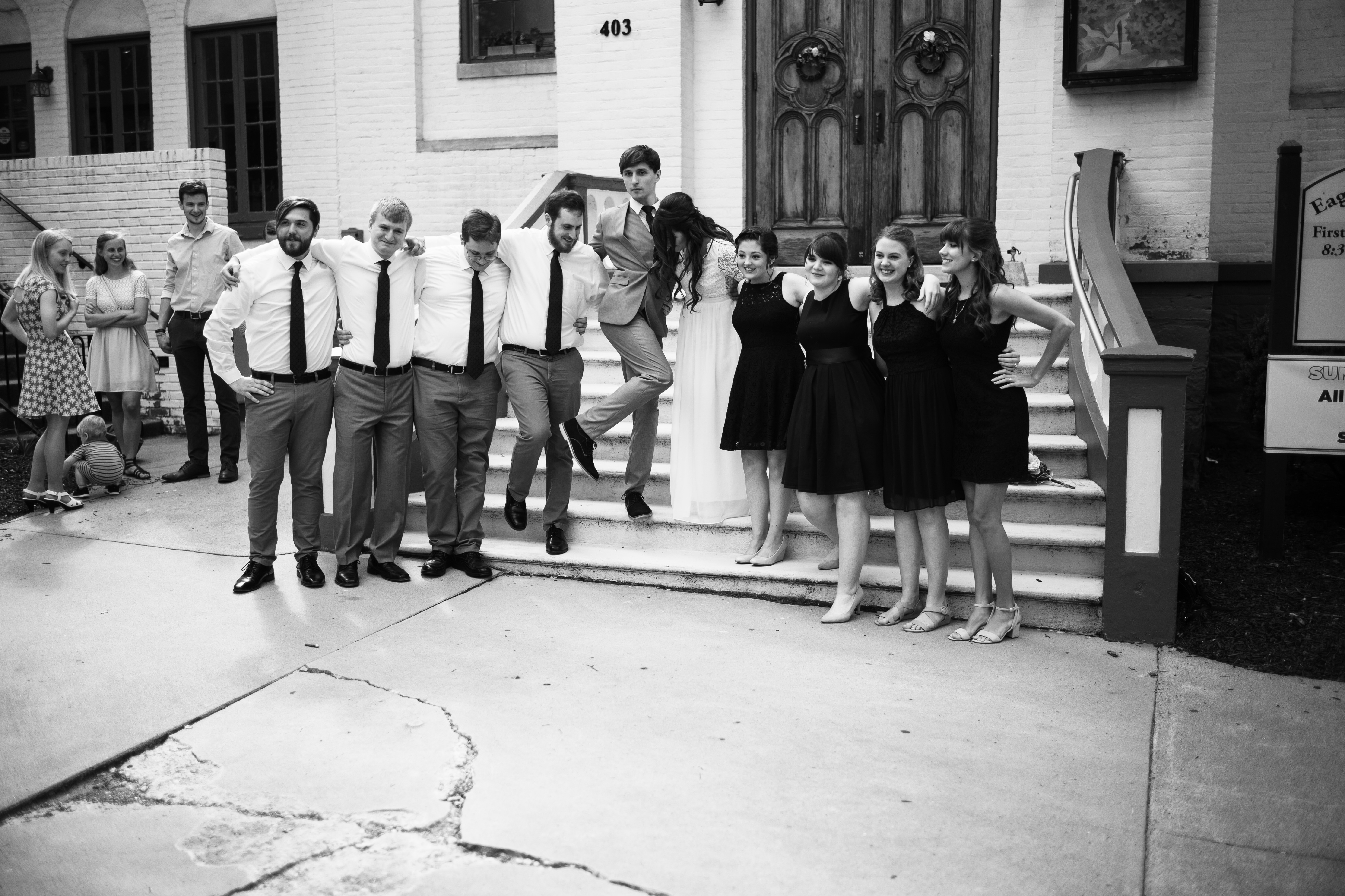 A lively group of friends poses on the steps of a charming venue, exuding a playful and celebratory mood. The composition features an energetic mix of black and white attire, with the bride standing out in white, highlighting their bonds of friendship. The soft natural light adds a warm glow, enhancing the joyful atmosphere of the moment.