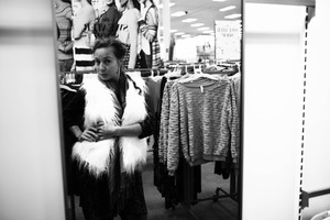 In a monochromatic setting, a woman poses confidently in front of a mirror, wearing a striking white faux fur vest that contrasts beautifully with her dark attire. The composition captures her poised stance amidst racks of clothing, creating a sense of contemporary style and personal expression. Soft lighting enhances the casual and intimate atmosphere of the scene, inviting a glimpse into a moment of self-exploration and fashion.