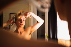A candid moment captures an individual preparing in front of a mirror, drenched in soft, warm light. The intimate setting conveys a blend of vulnerability and confidence, highlighted by the subject's retrospective gaze. The composition, framing both the subject and their reflection, creates an engaging depth that invites the viewer into this private ritual.