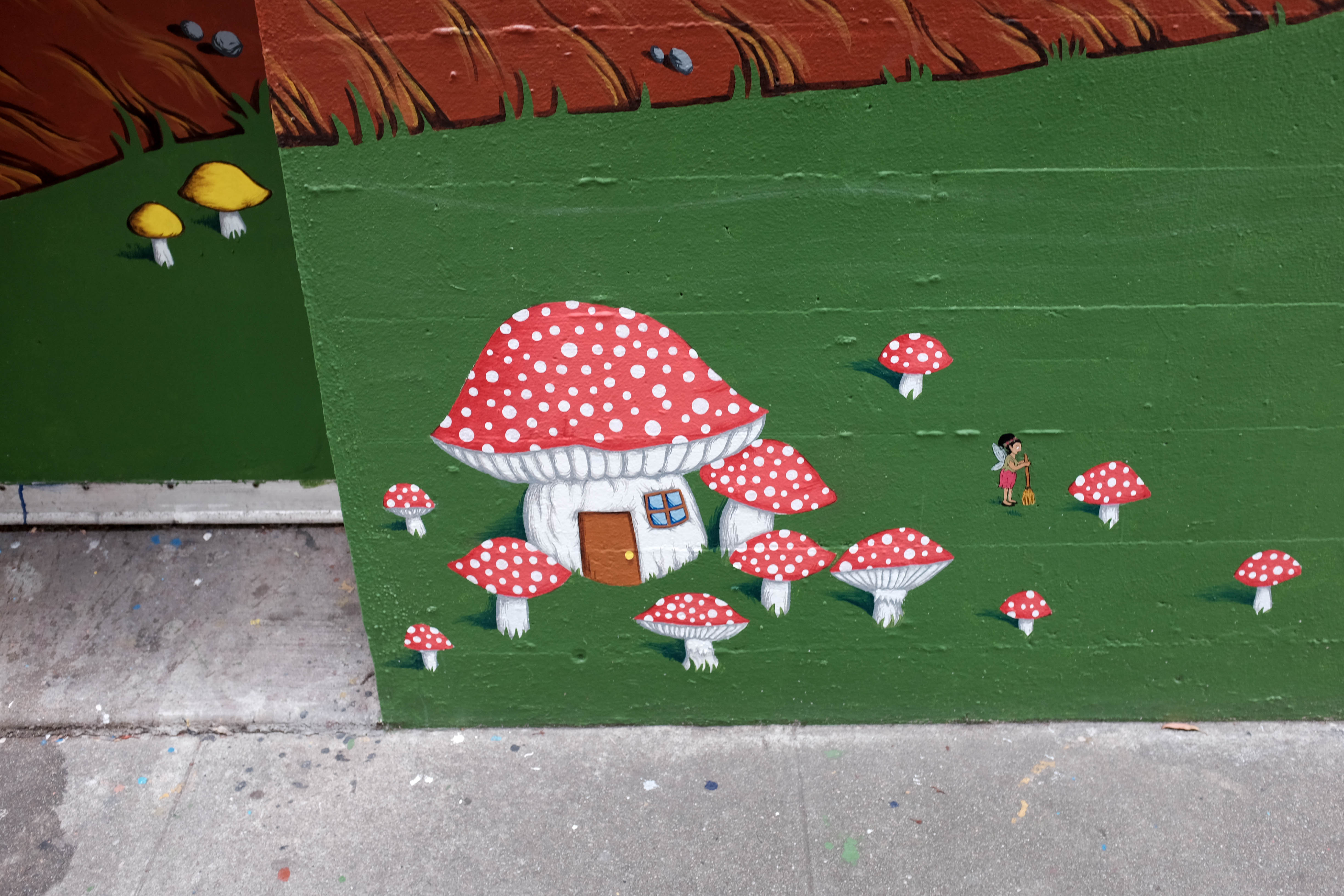 This vibrant mural showcases a whimsical scene of oversized red and white mushrooms, creating a fantastical atmosphere. The cheerful greens of the background and the playful composition, featuring a small figure holding a basket, invite a sense of wonder and childlike joy. Sunlight casts a warm glow, enhancing the mural's lively colors and bringing the enchanting world to life.
