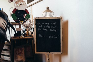 A vintage chalkboard sign humorously poses the question about coffee consumption, adding a playful touch to the cafe's ambiance. The soft, natural lighting enhances the warm, inviting mood, while adjacent holiday decorations hint at a festive atmosphere. This composition creates a charming snapshot of everyday life, blending wit with seasonal cheer.