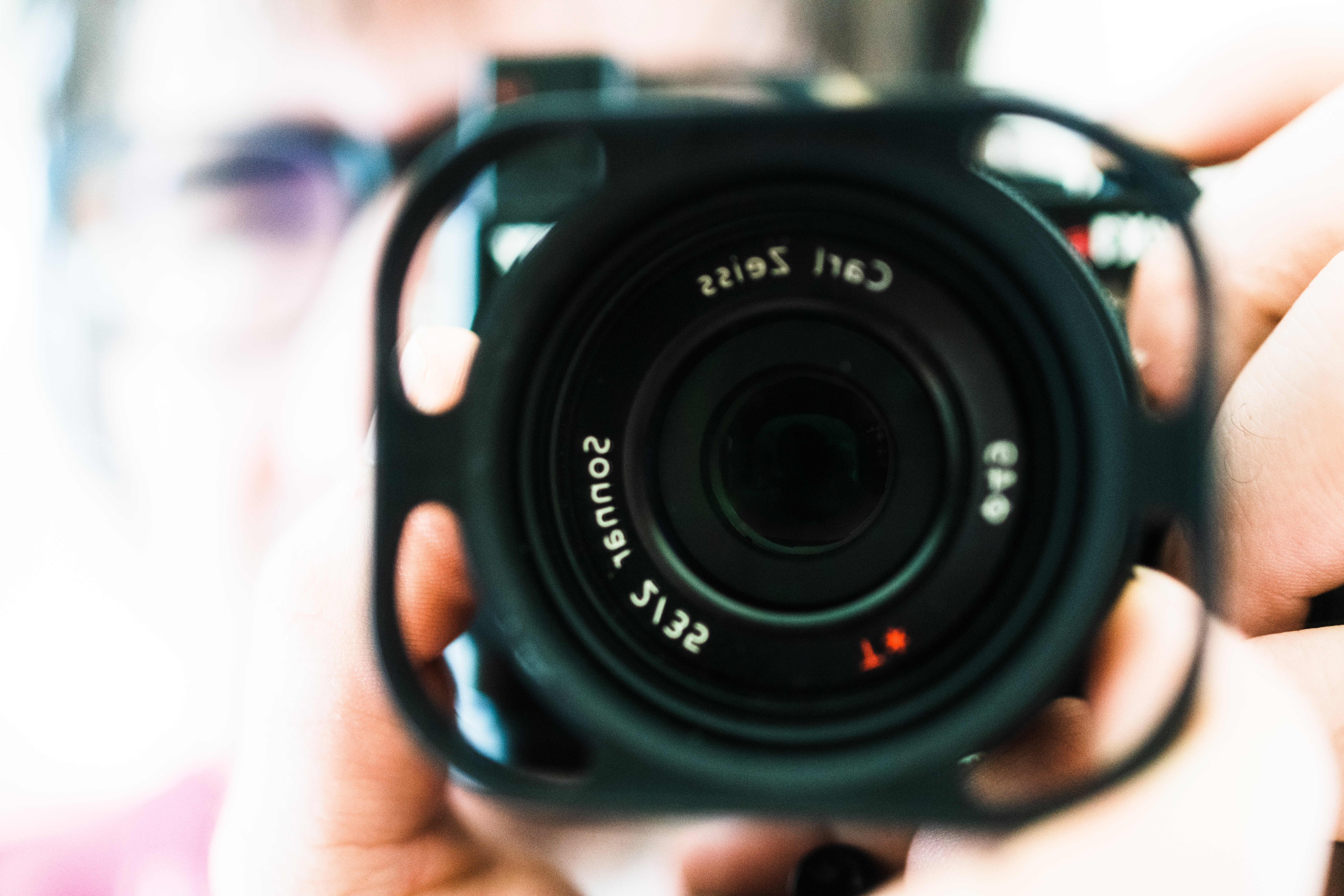 In this striking self-portrait, the photographer captures their own reflection through the lens of a camera, inviting viewers into a moment of introspection. The soft focus on the background creates a dreamy atmosphere, emphasizing the stark detail of the camera's lens and the gentle hints of color from the photographer's attire. The composition balances light and shadow, evoking a sense of curiosity about the act of capturing the world around us.