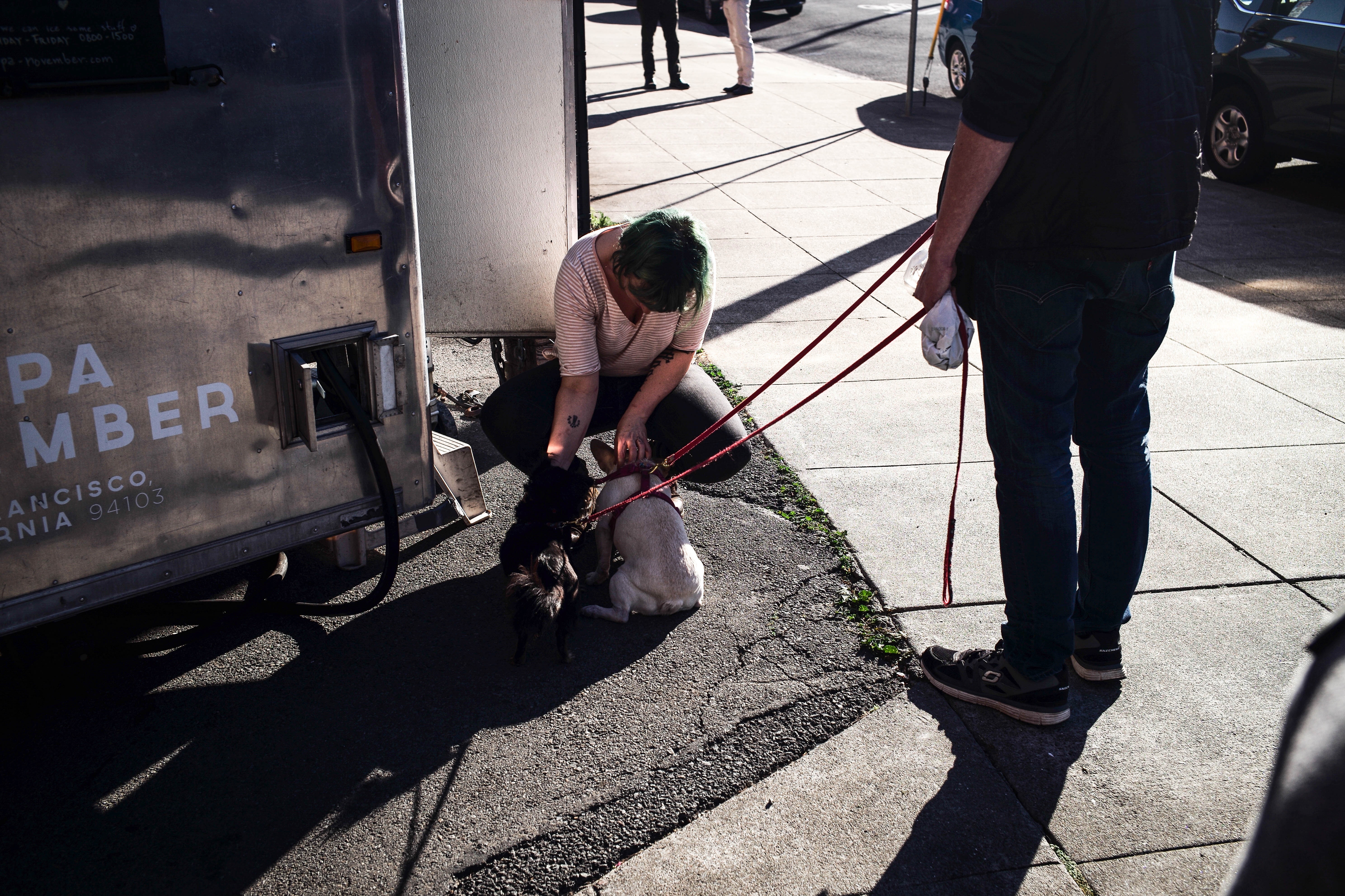 The photograph captures a moment of tenderness as a person with green hair crouches down to greet two leashed dogs on a sunlit city sidewalk. The warm, natural light emphasizes the playful interaction, creating a welcoming atmosphere amidst the bustling urban environment. The composition balances the humans and dogs, drawing attention to their connection against the backdrop of a food truck and casual street life.