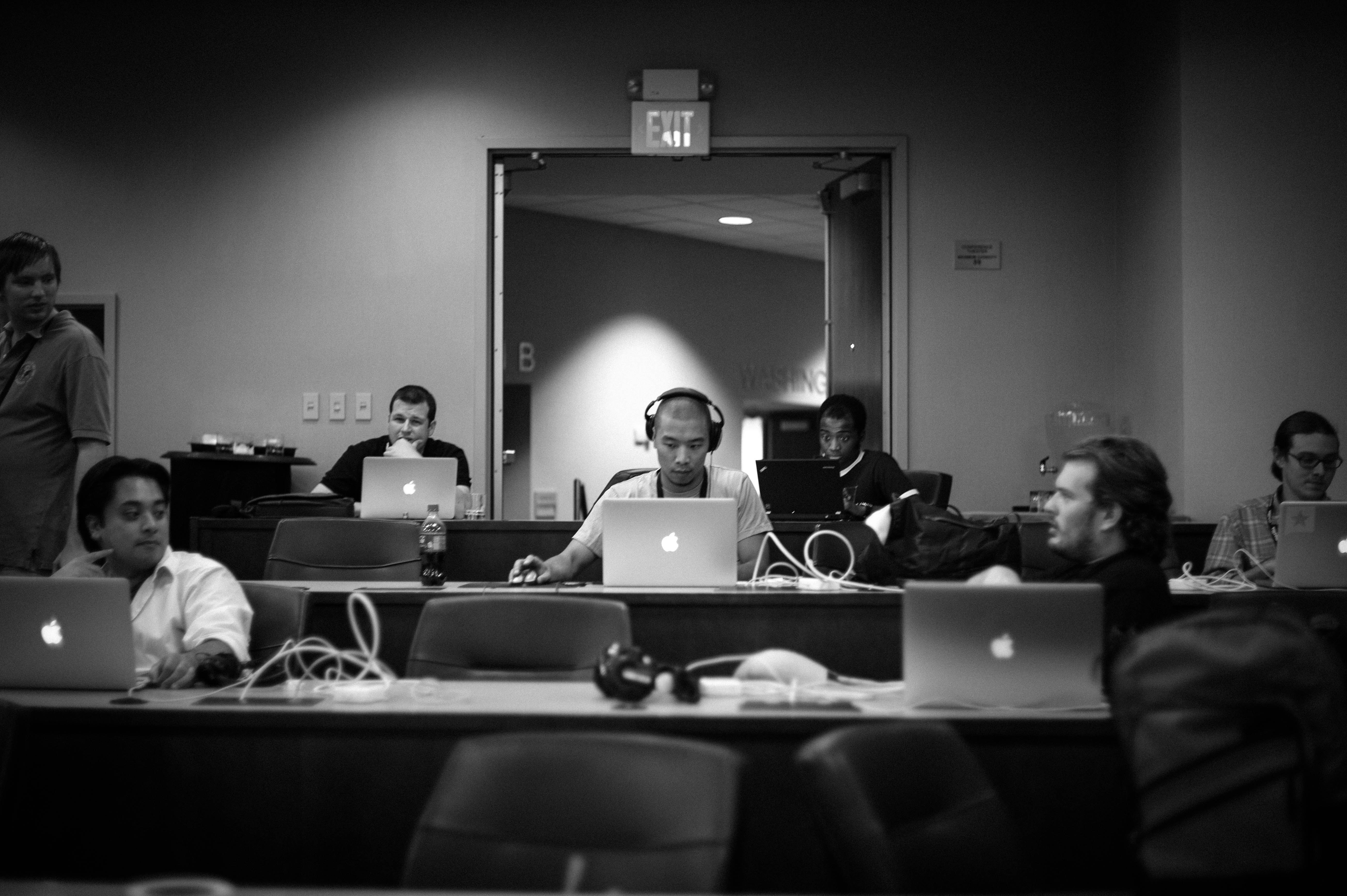 In a dimly lit room, a group of individuals intently engage with their laptops, the soft glow of their screens illuminating their concentrated faces. The composition draws the eye to the central figure wearing headphones, surrounded by scattered cables and the quiet chaos of productivity. The monochrome palette enhances the mood of earnestness and focus, reflecting a shared dedication in this communal workspace.