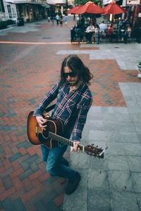 A lone guitarist exudes a relaxed vibe, immersed in his soulful performance on a cobblestone street. The warm afternoon light casts soft shadows, enhancing the vibrant colors of his plaid shirt and the rustic tones of his guitar. In the background, people gather around cozy tables, creating a lively yet intimate atmosphere.