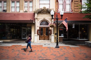 A woman walks past the elegantly detailed entrance of the Masonic Temple, embodying a serene moment in an urban setting. The rich textures of the brick pathway and the warm wood tones of the door contrast with the muted storefronts, while the soft, diffused lighting lends a calm atmosphere to the scene. Flags and hanging flower baskets add a hint of color and life, inviting the viewer to linger in this charming space.