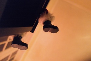 The photograph features a whimsical perspective, focusing on the black boots of a Santa figure, partially hidden and dangling from above. Warm, soft lighting casts an inviting glow, creating a cozy yet slightly mysterious atmosphere, hinting at the joy and surprise of the holiday season. The composition draws the viewer's eye upward, inviting a sense of curiosity about what lies beyond the frame.