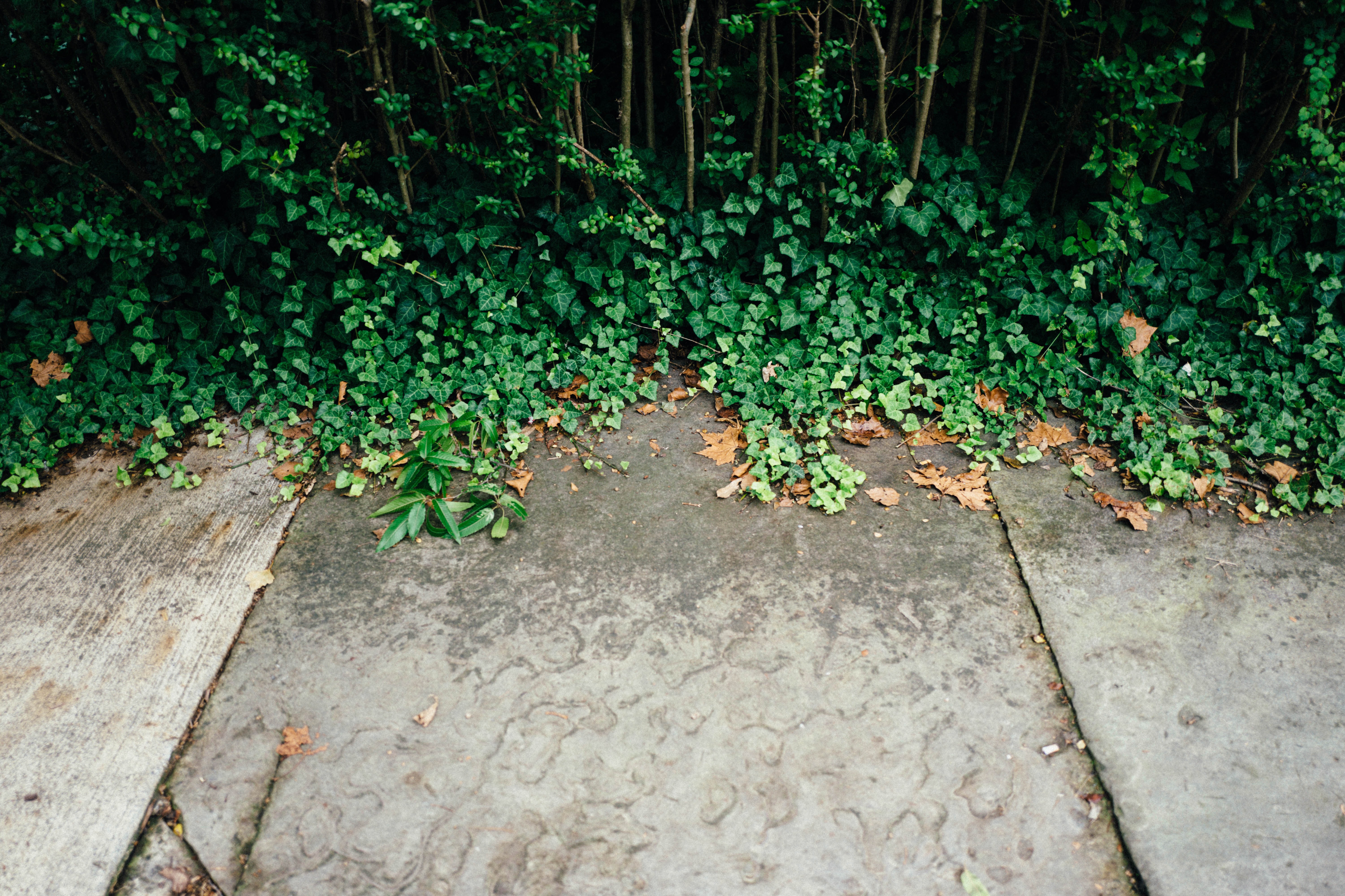 This photograph captures a serene moment where lush green ivy cascades over worn concrete pathways, creating a contrast between the natural and the man-made. The muted lighting adds a soft, gentle mood, inviting contemplation and a sense of peace. Fallen leaves hint at the passage of time, integrating the cycle of life into the scene.