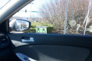 Through the car window, a vibrant green sign advertising fencing classes stands out against the muted background of leafless bushes and a stark winter sky. The natural light bathes the scene, adding clarity to the announcement, while a sense of calm punctuates the urban environment. The composition captures a moment of potential, juxtaposing everyday life with the unique allure of a new pursuit.
