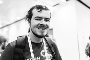 Captured in a bustling environment, this black-and-white photograph showcases a young man with a warm smile, revealing a friendly demeanor. The soft lighting enhances the mood of camaraderie, while the blurred figures in the background suggest a lively event or gathering. His casual attire and the strap of a backpack hint at a relaxed, yet engaged atmosphere.