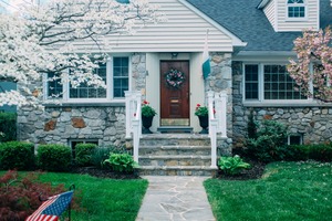 The photograph captures a warm and inviting front entrance of a stone house, framed by blooming trees and vibrant greenery. A welcoming wreath adorns the wooden door, while pots of red flowers add pops of color, all bathed in soft, natural light that enhances the tranquil, pleasant atmosphere.
