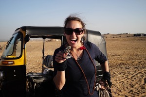 In this vibrant photograph, a woman exudes excitement against the backdrop of a vast, open desert, capturing an adventurous spirit. The warm, golden sunlight enhances her smile and playful pose, highlighting her carefree expression as she holds up a small figure. The composition frames her with the colorful auto-rickshaw, contrasting the sandy expanse and creating a lively, joyous atmosphere.