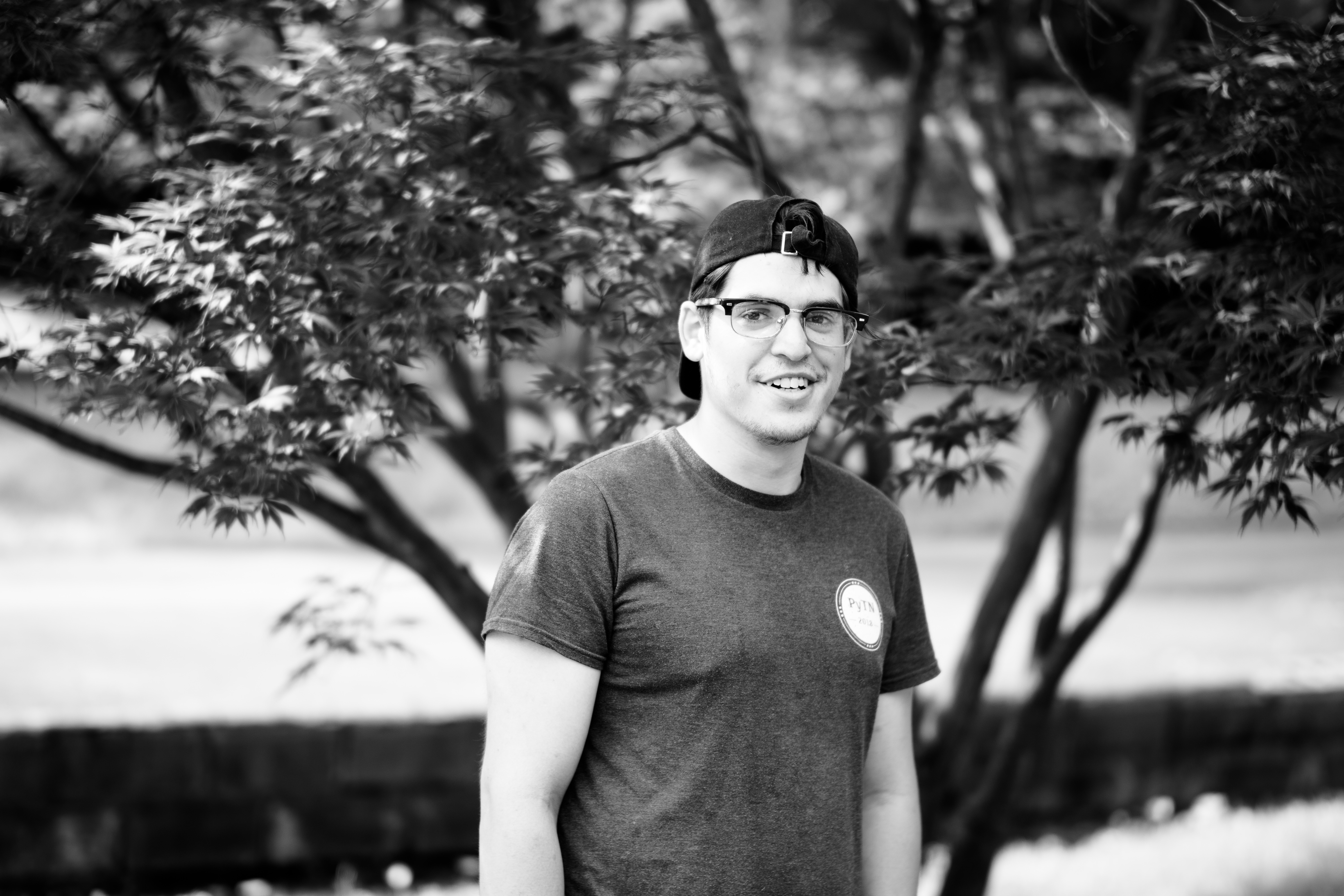 A young man smiles warmly against a backdrop of softly blurred foliage, capturing an inviting and relaxed mood. The monochromatic tones enhance the photograph's simplicity, drawing focus to his friendly expression and casual attire. Natural light filters through the trees, creating a gentle ambiance that complements the subject's approachable demeanor.