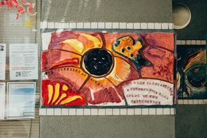 This photograph captures a colorful mural featuring a central sunflower against a muted gray backdrop. The bright hues and playful composition exude a sense of creativity and warmth, enhanced by the natural light that softly highlights the textures of the paint. The juxtaposition of the mural with the subtle architectural features draws the viewer’s eye, inviting reflection on the interplay between art and environment.