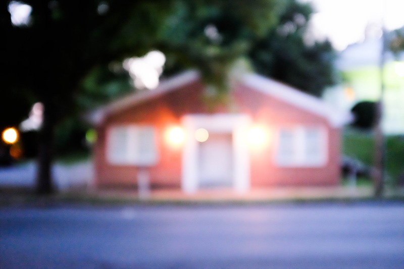 This photograph captures a softly blurred image of a modest brick house, illuminated by warm lights that glow invitingly against the twilight. The mood is tranquil and slightly nostalgic, evoking feelings of comfort and familiarity, despite the lack of sharp details. The composition focuses on the house's symmetrical features, framed by encroaching shadows from surrounding trees, creating a sense of seclusion in the encroaching evening.
