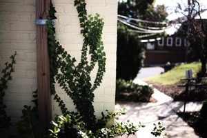 This photograph captures a vibrant ivy vine gracefully climbing up a textured yellow wall, creating a stunning contrast against the soft sunlight. The composition draws the eye to the intricate patterns formed by the leaves, evoking a sense of tranquility and natural beauty. The background subtly fades, hinting at a serene outdoor setting while the light enhances the organic textures and colors, enriching the overall mood.