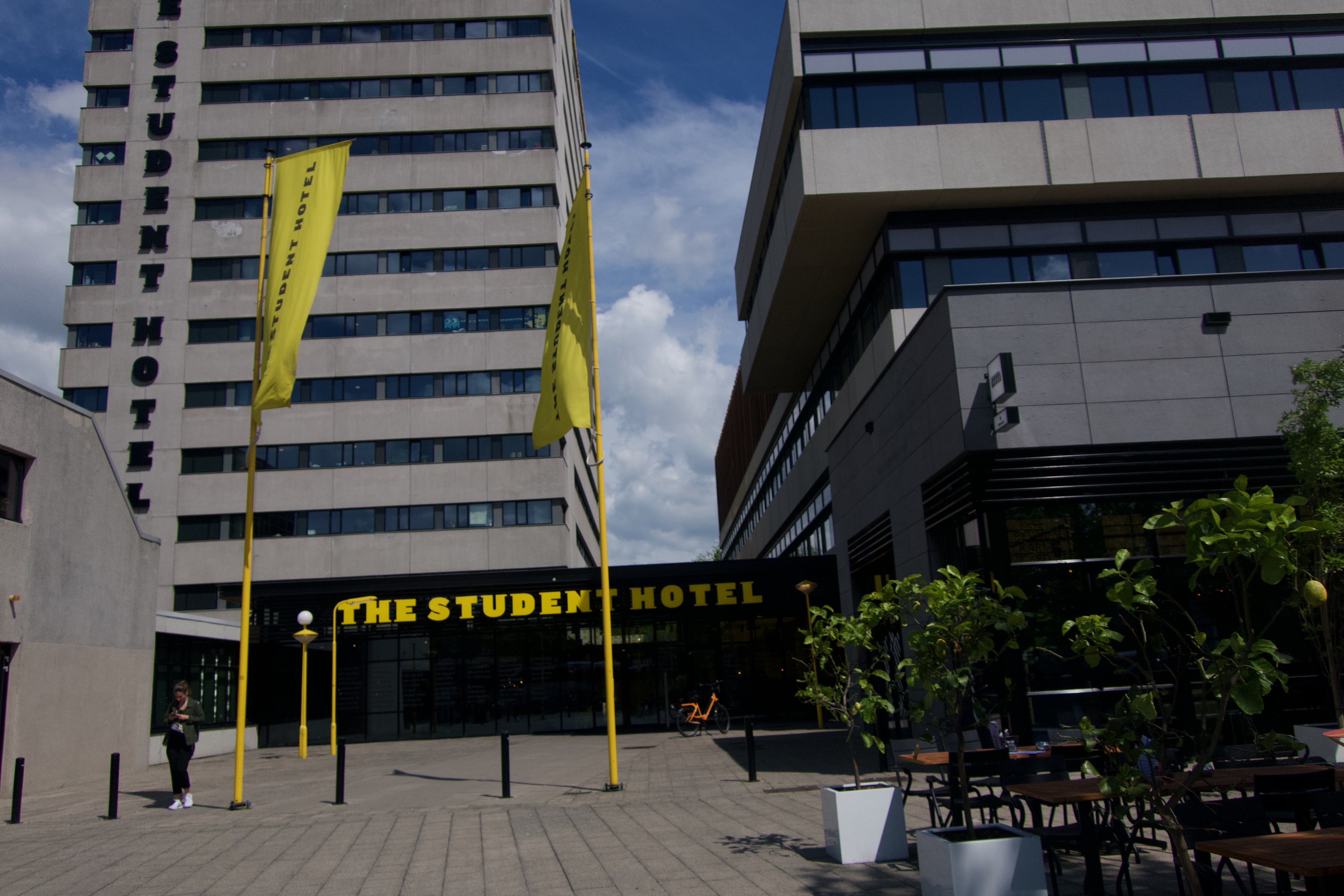 The photograph captures the vibrant entrance of The Student Hotel, characterized by its modern architectural lines and bold yellow flags fluttering in the breeze. Bright sunlight bathes the scene, creating a lively atmosphere that invites exploration. The juxtaposition of clean, angular structures against a blue sky enhances the sense of urban energy and accessibility.