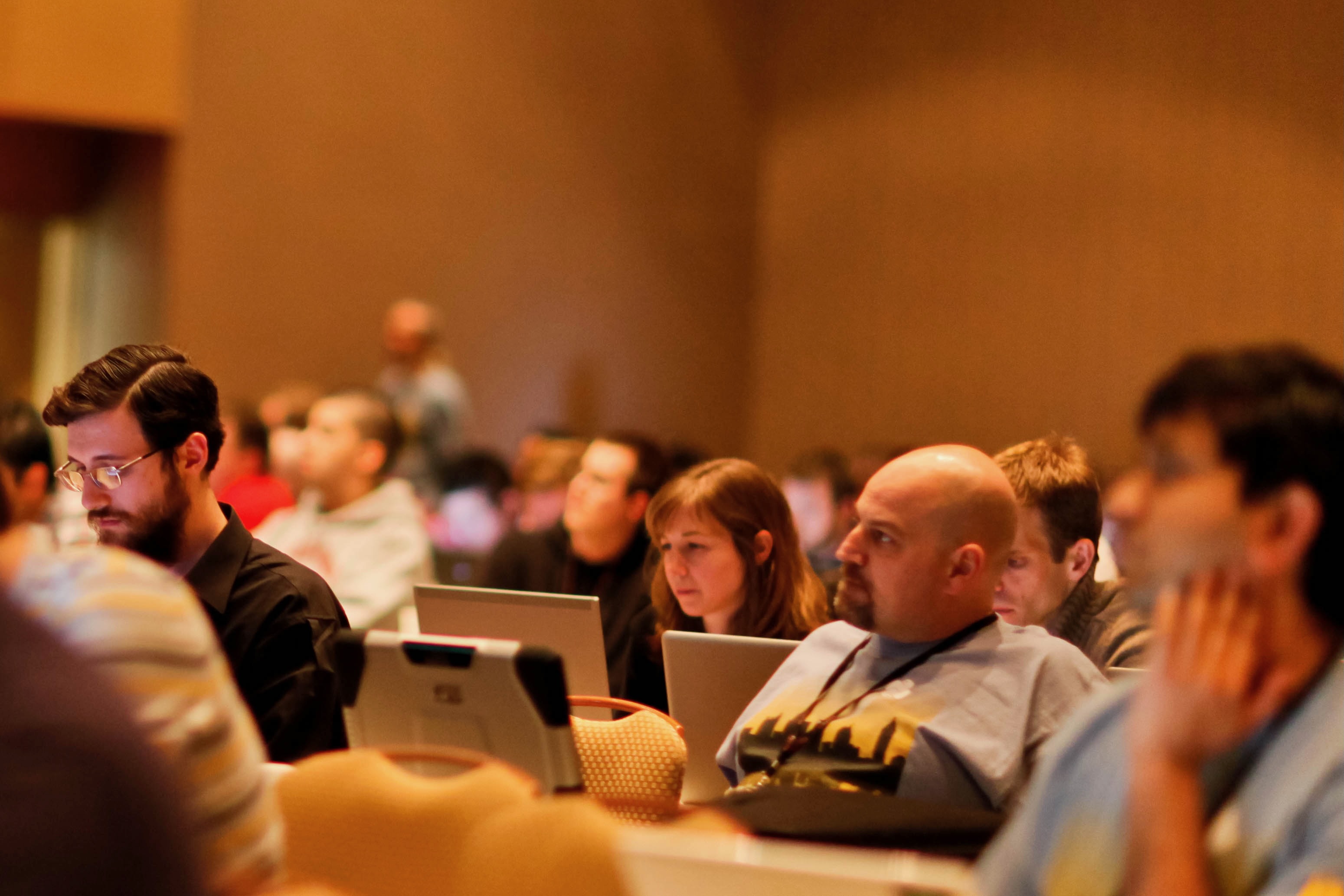 In a dimly lit conference room, an attentive audience focuses on their laptops, embodying a sense of concentration and purpose. The warm tones of the background create a cozy yet serious atmosphere, while the variation in the subjects' expressions hints at a shared pursuit of knowledge. Soft lighting gently highlights their faces, emphasizing the individual moments of engagement amidst a collective experience.