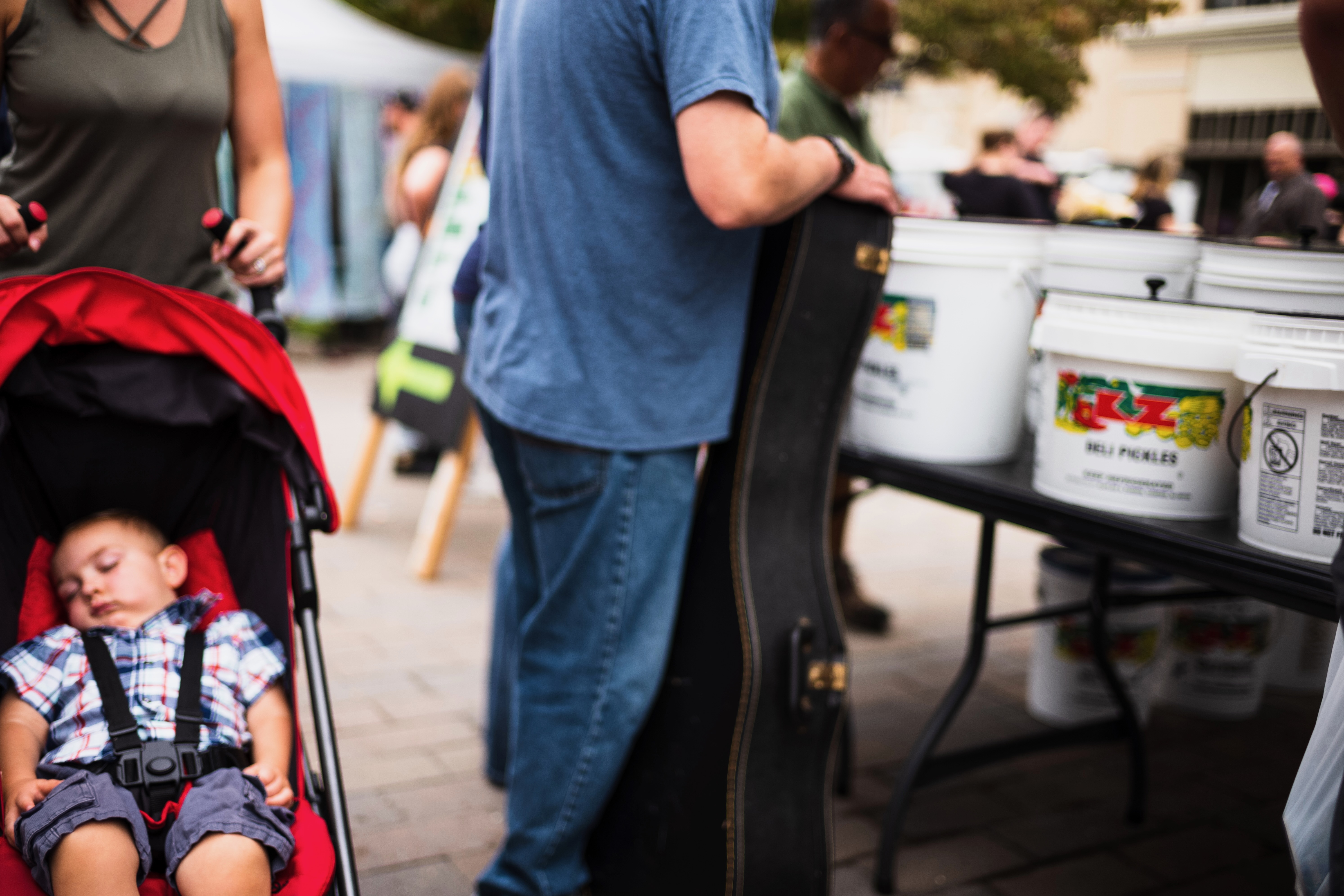 In this candid scene, a peaceful child drifts off to sleep in a vibrant red stroller amid the bustle of a local market. The soft focus on the background hints at the lively atmosphere, with people engaging in various activities, while warm daylight envelops the moment, creating a serene contrast to the surrounding chatter. The composition highlights the juxtaposition of childhood innocence against the lively market, inviting a sense of tranquility amid the busyness.