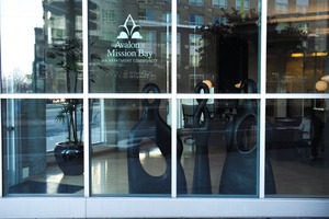 The photograph captures a sleek entryway showcasing abstract black sculptures against the backdrop of a glass facade. Soft, muted lighting creates a tranquil mood, reflecting the elegance of the Avalon at Mission Bay community. The composition invites the viewer's gaze through the transparent panes, blending indoor and outdoor elements seamlessly.