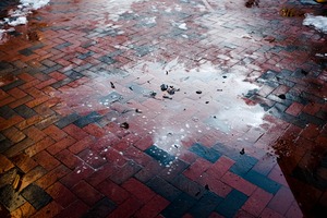 The photograph captures a close-up view of a rain-soaked, patterned brick pavement, where scattered puddles mirror the sky above. The mood is reflective and somber, enhanced by the soft, diffused lighting that glimmers off the wet surface. Bits of debris disrupt the otherwise tranquil scene, adding a layer of imperfection to the urban landscape.
