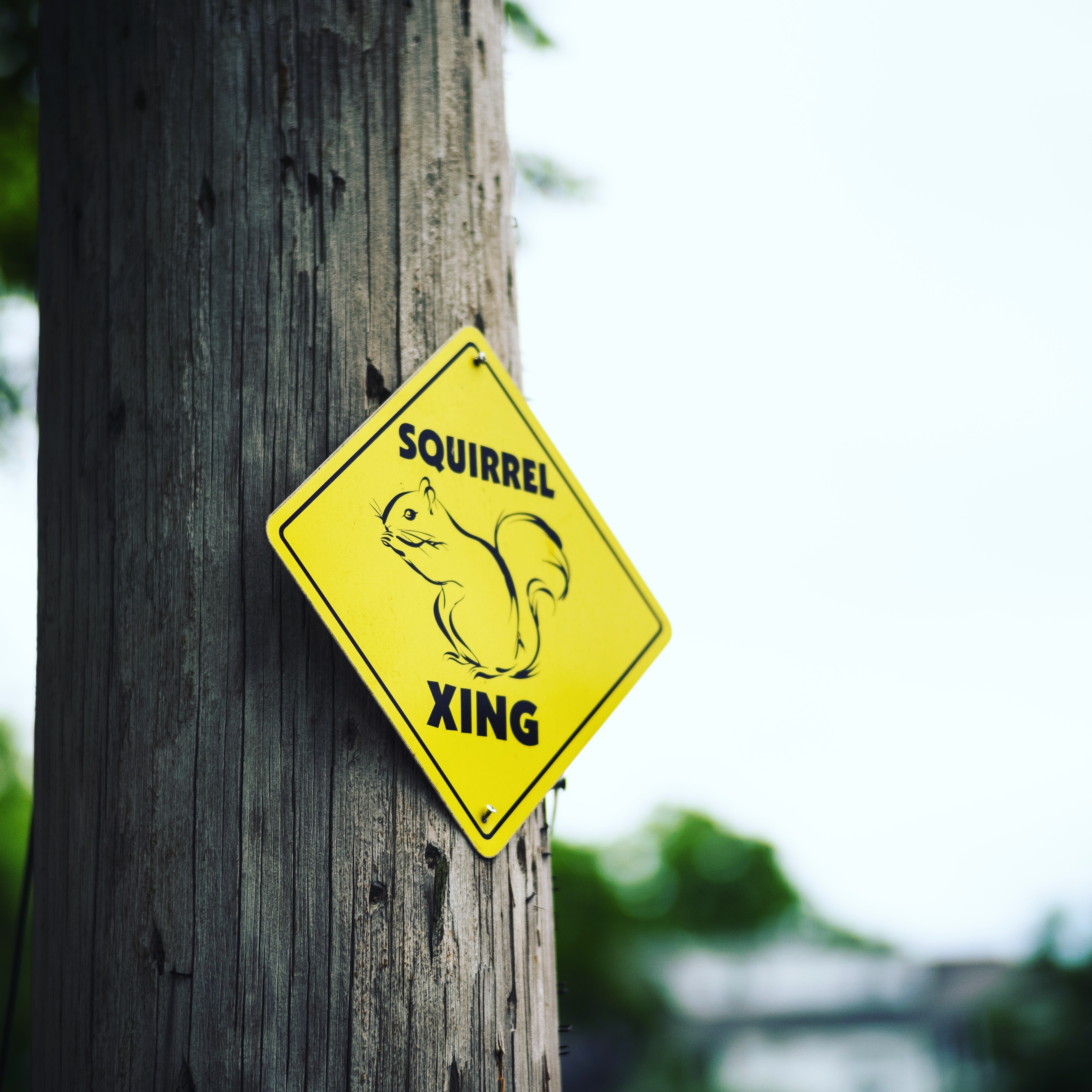 A bright yellow 'Squirrel Xing' sign leans against a textured wooden pole, capturing a playful moment in everyday life. The soft focus of the background adds a serene, lighthearted mood, inviting passersby to notice the charm in mundane details. The contrast between the vivid sign and the natural elements subtly emphasizes the importance of caring for local wildlife.