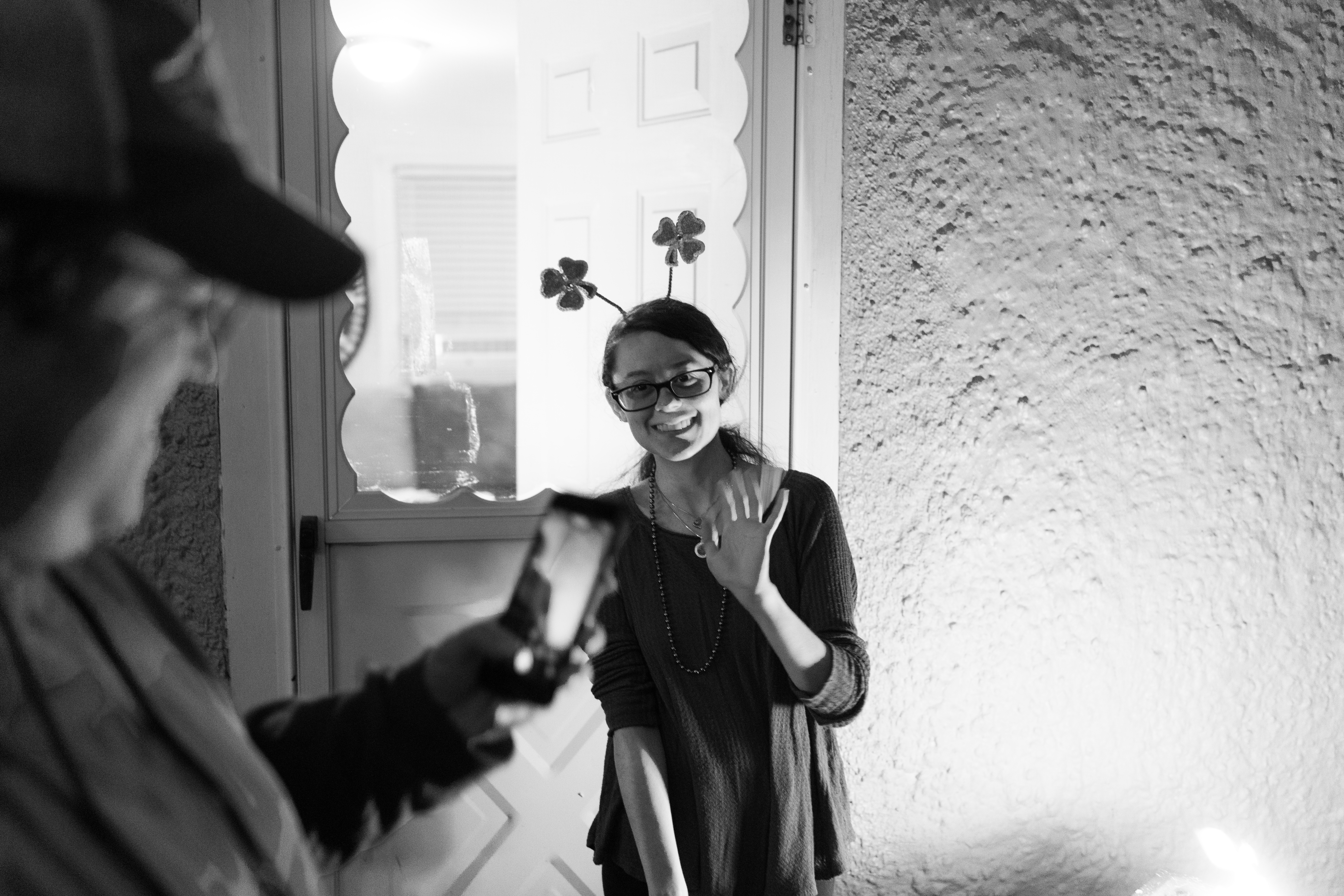 A young woman, adorned with playful shamrock headbands, stands at a doorway, beaming as she waves. The black and white composition brings a nostalgic mood, enhanced by soft lighting that highlights her cheerful expression amidst the evening shadows. The scene captures a moment of gentle connection, with a hint of curiosity from a figure in the foreground capturing her joy on a phone.