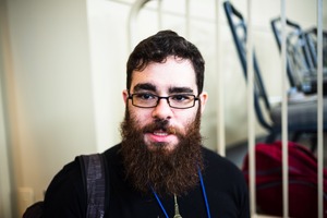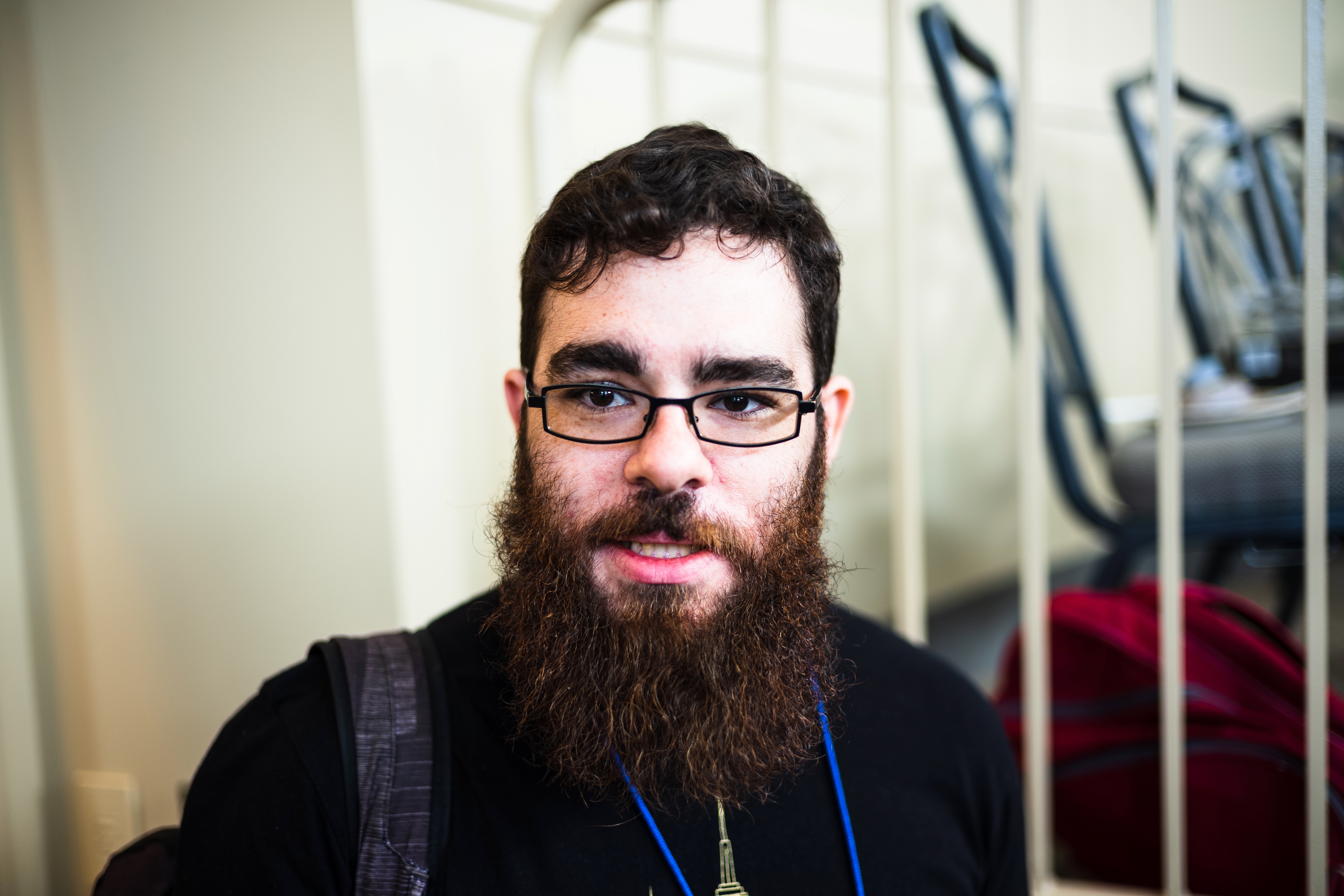 In this portrait, a young man with a thick beard and glasses gazes thoughtfully at the camera, exuding a sense of introspection. The soft lighting highlights his facial features and adds depth, while the muted background, filled with chairs and bags, emphasizes a casual, everyday setting. The composition draws the viewer in, inviting them to ponder his thoughts and feelings.