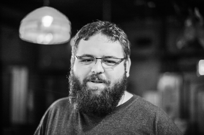The photograph captures a man with a full beard and glasses, exuding a relaxed and approachable demeanor in a dimly lit space. Soft overhead lights create a moody ambiance, accentuating his features while casting gentle shadows. The monochromatic palette enhances the intimate atmosphere, inviting viewers to share in this candid moment.