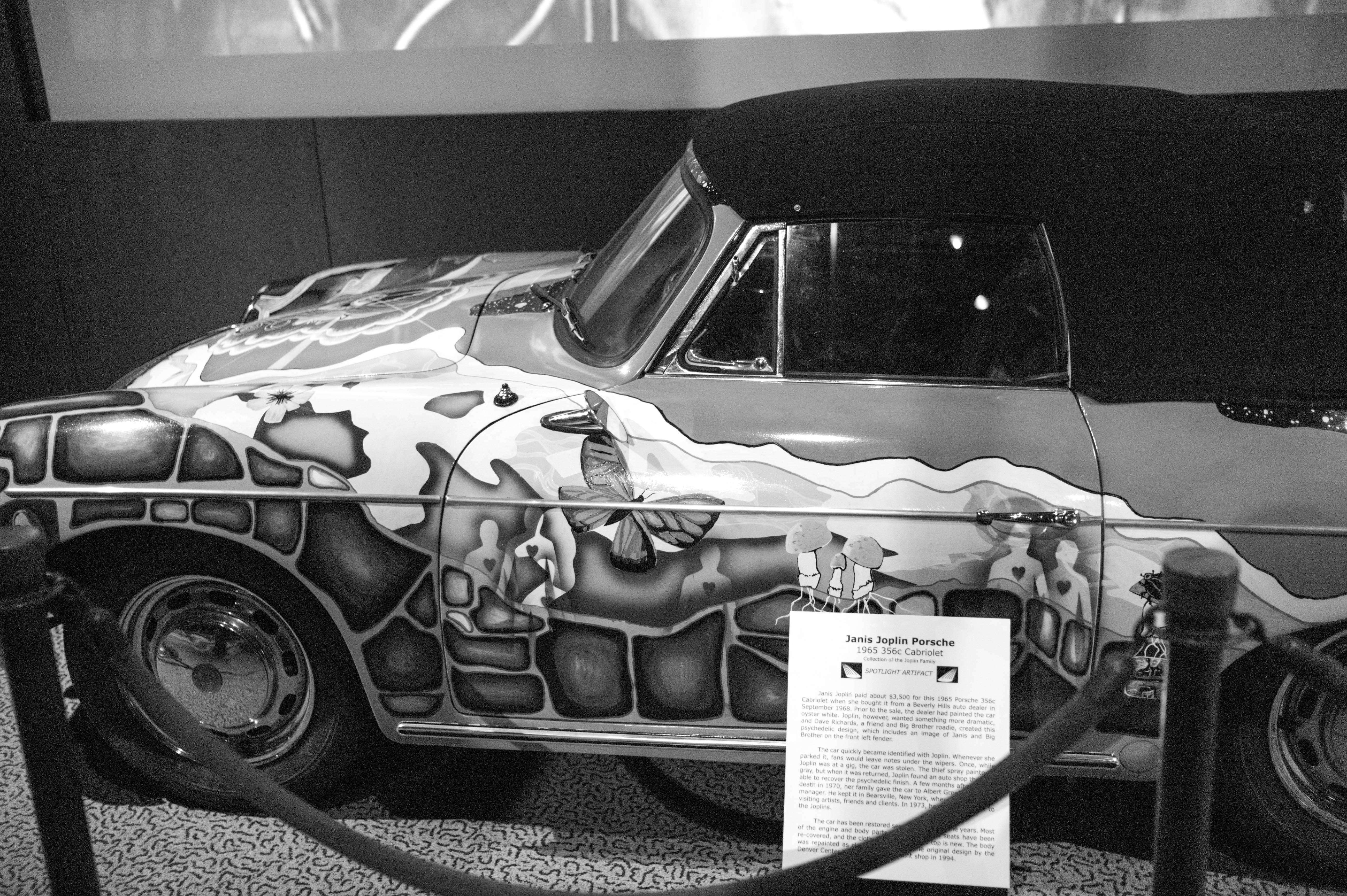 This striking photograph features a uniquely painted Porsche, capturing the essence of rock-and-roll history. The intricate designs and vibrant colors evoke a sense of nostalgia and rebellion, while the soft lighting highlights the vehicle’s artistic detailing. The composition, with the car framed by a simple barrier and a descriptive plaque, invites viewers to appreciate both the craftsmanship and the cultural significance of this iconic piece.