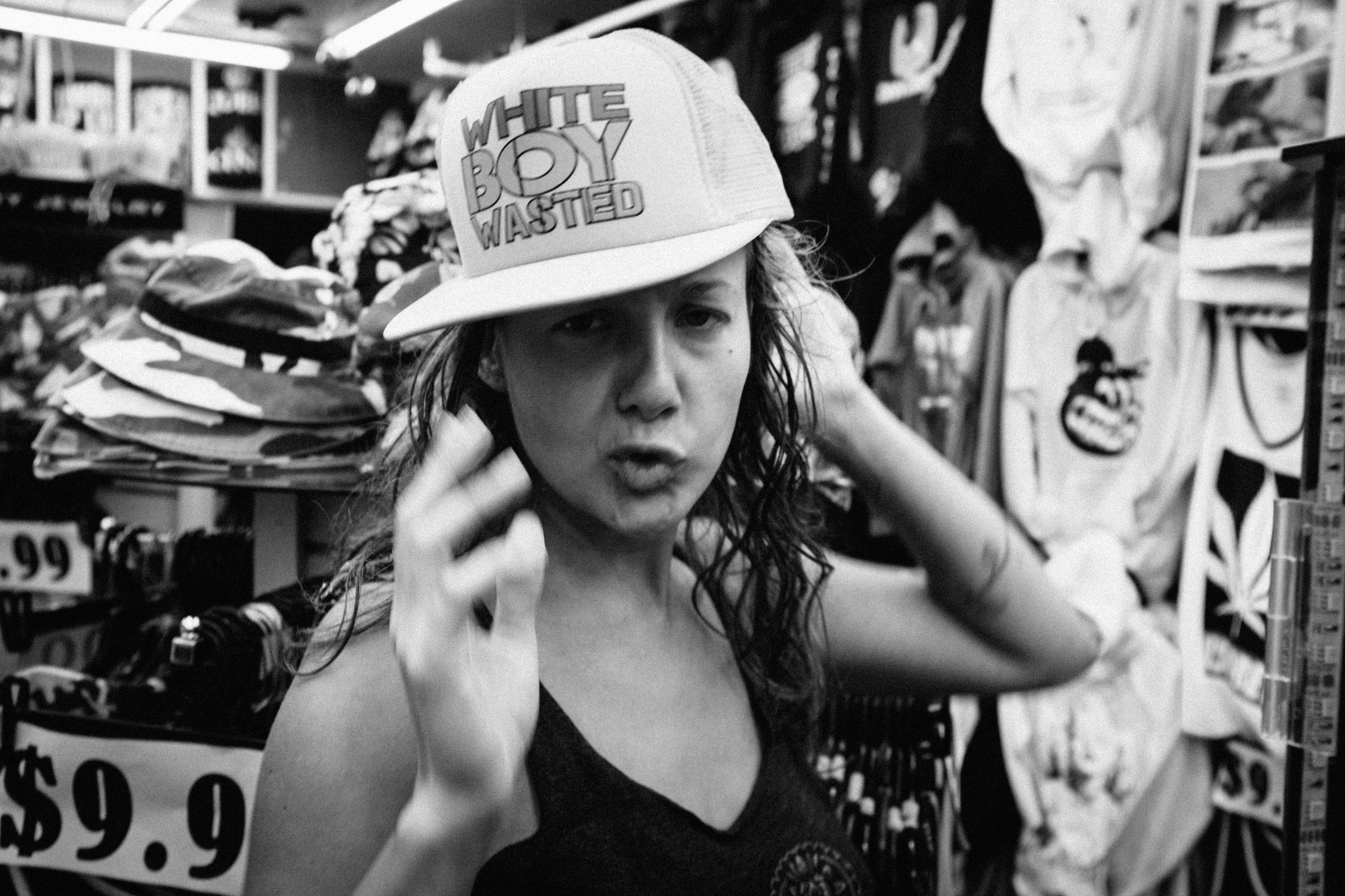 In this candid black-and-white photograph, a young woman strikes a playful pose while wearing a cap that boldly proclaims 'WHITE BOY WASTED.' The cluttered backdrop of merchandise adds a vibrant chaos, contrasting with her confident demeanor. The lighting creates a moody atmosphere, emphasizing her expressive features and the rebellious spirit captured in the moment.