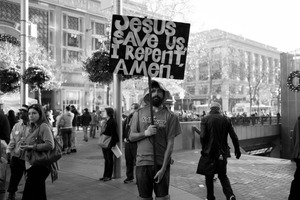 In a bustling urban setting, a man stands resolute with a bold sign bearing a desperate message for salvation. The black-and-white composition heightens the tension, capturing a moment rich with emotion against the backdrop of indifferent passersby. The stark lighting accentuates the man's earnest expression, contrasting his solitary conviction with the surrounding disinterest.