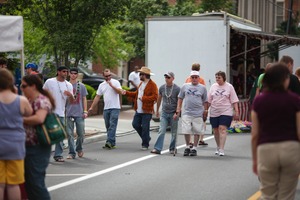A lively summer day captures a diverse group of individuals leisurely walking down a bustling street, filled with festive energy. The mix of casual attire and playful accessories, such as beaded necklaces, suggests a celebratory atmosphere, enhanced by warm, natural lighting filtering through the trees. The composition invites the viewer to feel the camaraderie among the participants, creating a vivid snapshot of community spirit.