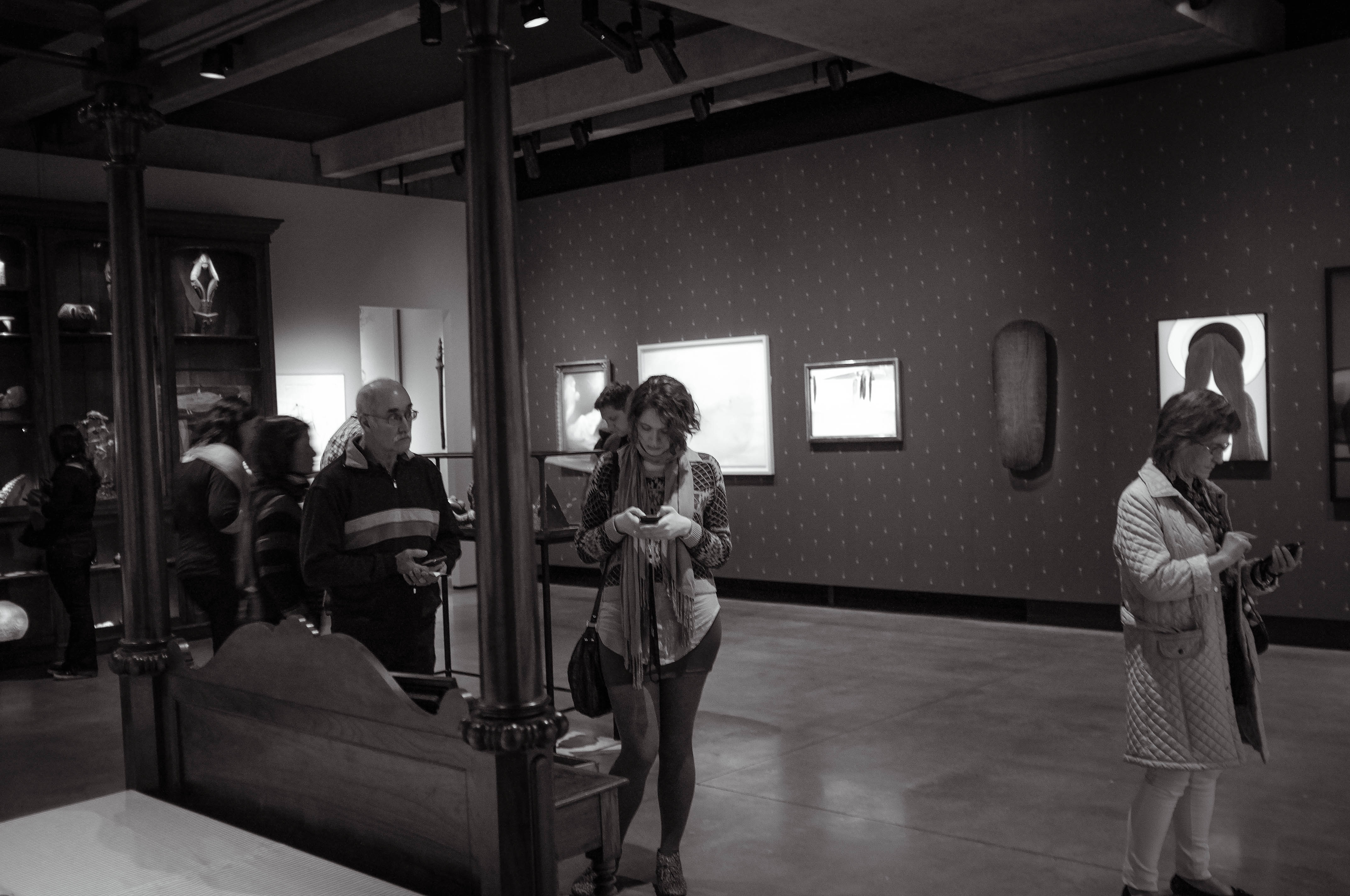 This monochromatic photograph captures a moment in a gallery filled with visitors, each absorbed in their own world. The interplay of light and shadow creates a contemplative mood, highlighting the contrast between the lively atmosphere and the individual experiences of the viewers. The composition leads the eye through the space, where art and observation coexist harmoniously.