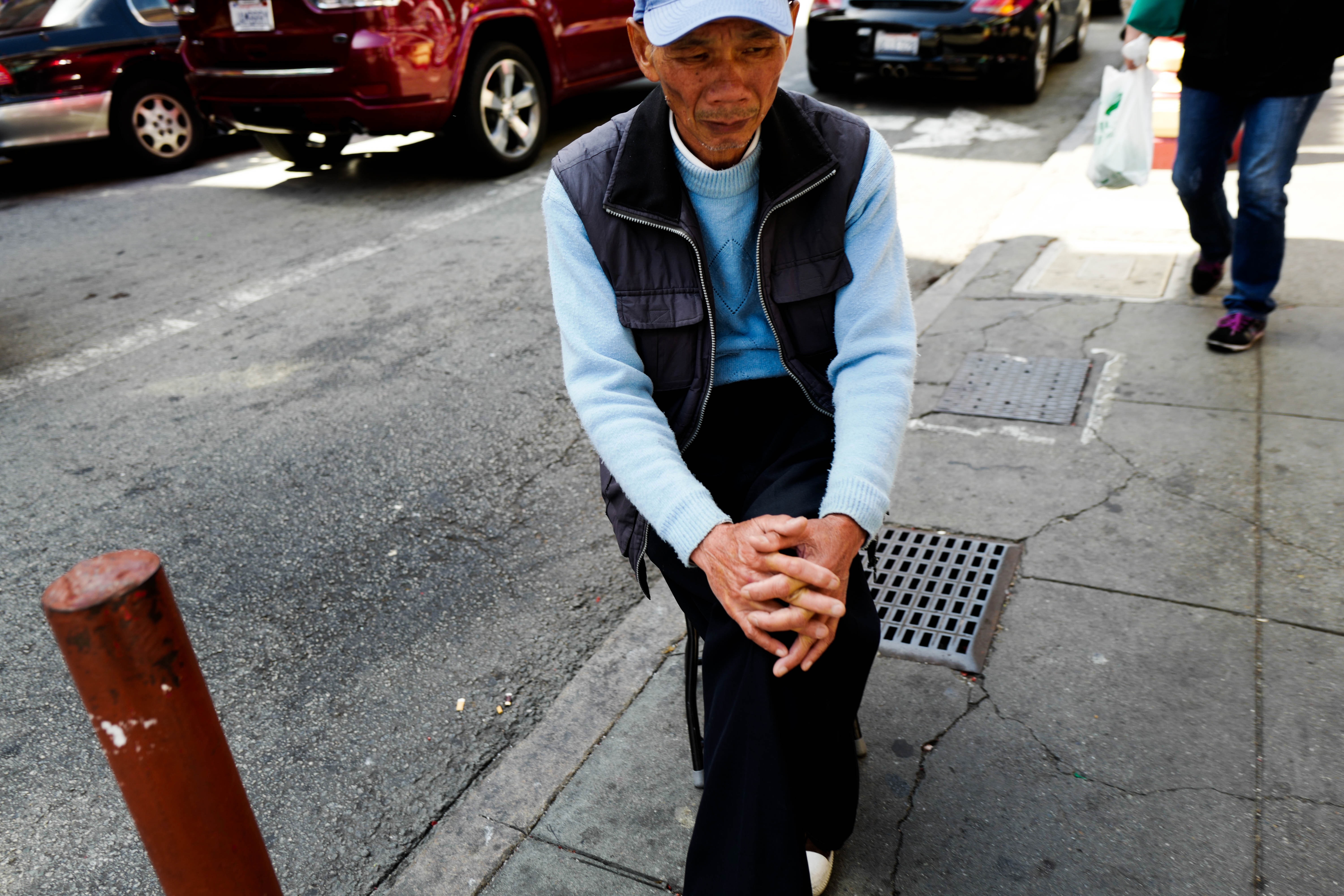 An elderly man sits on a chair at the edge of a bustling street, his hands thoughtfully clasped together. The light captures gentle shadows, lending a quiet serenity to his weathered face amidst the urban chaos. The composition draws the eye towards his introspective posture, contrasting the movement of passersby behind him, evoking a sense of solitude in a lively environment.