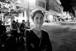 A young woman stands confidently against a softly illuminated backdrop, showcasing the charm of a bustling night scene. Her gentle smile contrasts with the dark surroundings, evoking a sense of warmth amidst the cool night air. The blurred figures in the background and subtle lighting create a cinematic atmosphere, inviting viewers into a moment of connection and friendliness.