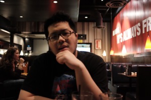 In this dimly lit café, a young man sits thoughtfully, resting his chin on his hand, creating a mood of introspection. The soft glow from overhead lights contrasts with the dark furnishings, while a woman in the background adds a touch of life to the scene. The composition draws focus on the subject’s pensive expression, inviting viewers to ponder his thoughts.