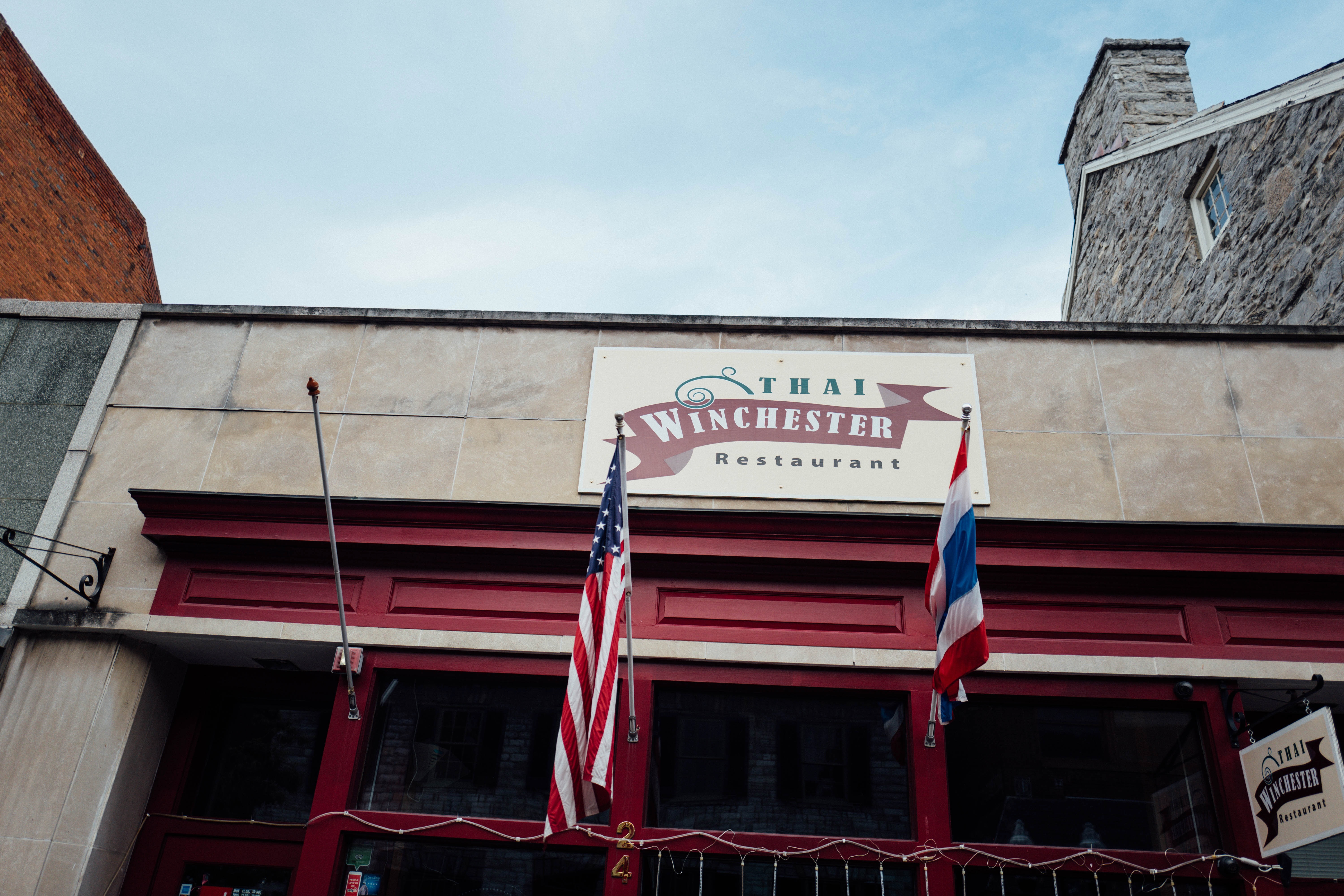 The photograph showcases the inviting facade of the Thai Winchester Restaurant, adorned with vibrant flags that hint at the cultural blend. The light, soft and diffuse, creates an inviting atmosphere that beckons passersby to indulge in an authentic culinary experience. The composition captures both the charm of the establishment and the quaint architectural details of the surrounding area, evoking a sense of warmth and community.