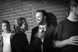 Set against a textured brick wall, the photograph captures a candid moment among four men engaged in conversation. The interplay of shadows and soft lighting creates an intimate, almost nostalgic atmosphere, highlighting their relaxed demeanor and expressions, suggesting camaraderie and connection amidst the backdrop of a lively evening.