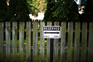 This photograph features a prominent, weathered sign labeled 'RESERVED,' flanked by arrows indicating directions. Set against a backdrop of lush green foliage and a rustic wooden fence, the image conveys a serene yet curious mood, inviting contemplation on the nature of reservation and space. The dappled sunlight filters through the leaves, creating a gentle interplay of light and shadow that emphasizes the simplicity of the scene.