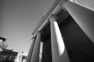 The photograph captures the towering columns of a classical building, viewed from a low angle, emphasizing their grandeur against a clear sky. The interplay of light and shadow enhances the texture of the columns and the brick facade, creating a dramatic contrast in this black-and-white composition. The mood is both imposing and contemplative, inviting the viewer to ponder the architectural elegance and historical significance of the structure.