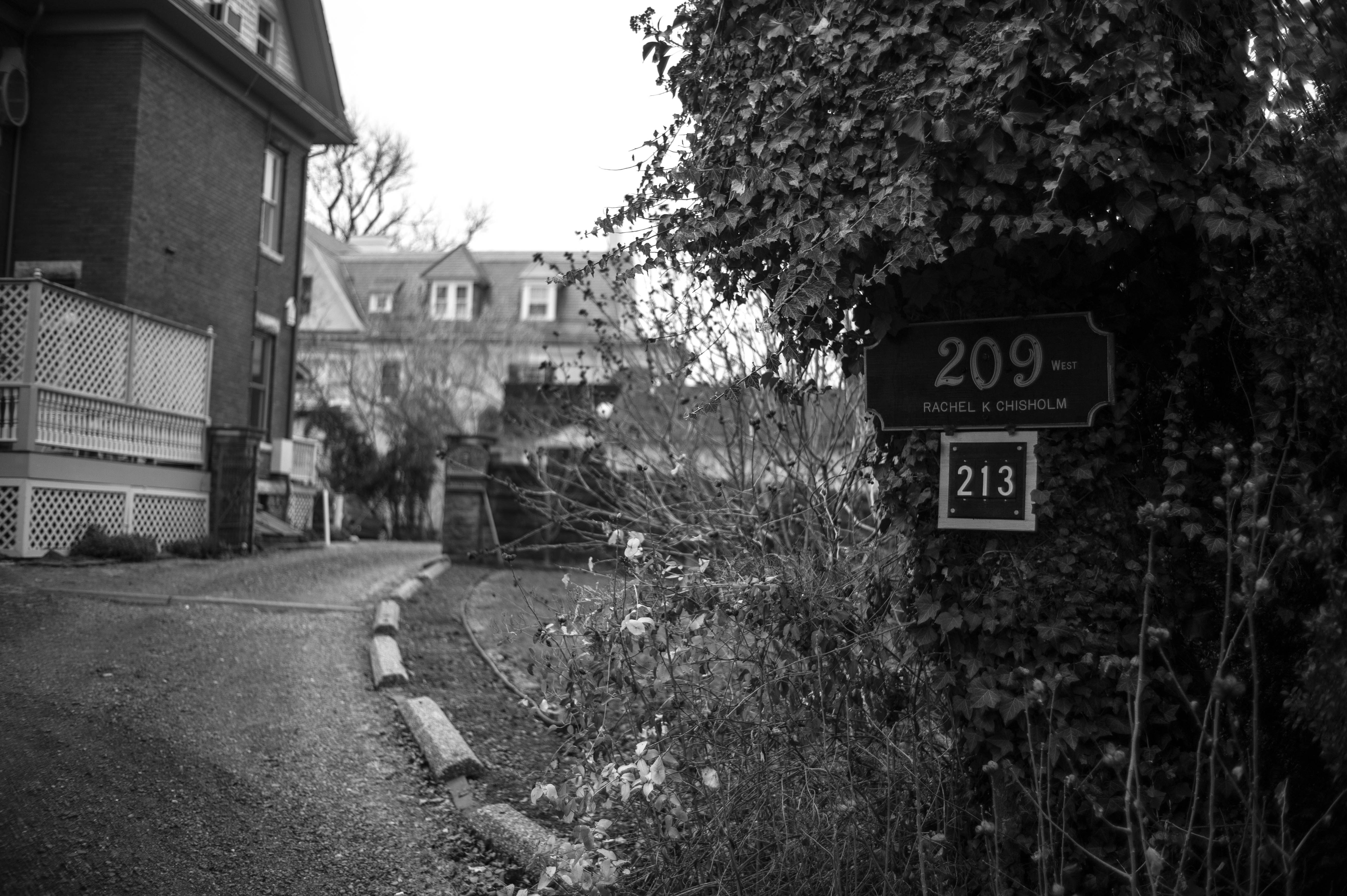 The photograph captures a quiet, inviting scene of a winding driveway leading to a modest brick house framed by wild ivy. The black and white contrast emphasizes the vintage charm and somewhat nostalgic mood, evoking memories of forgotten stories. Subtle details, like the weathered house numbers, add an air of mystery and history to the tranquil composition.
