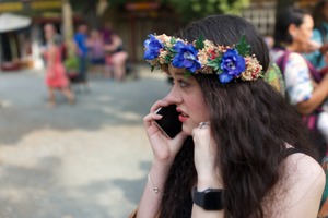 In this vibrant scene, a young woman adorned with a floral crown speaks intently on her phone, highlighting a moment of connection amid the lively surroundings. The soft natural light gently illuminates her features, casting a warm and inviting atmosphere. In the blurry background, people explore the festive environment, enhancing the sense of a shared celebration.