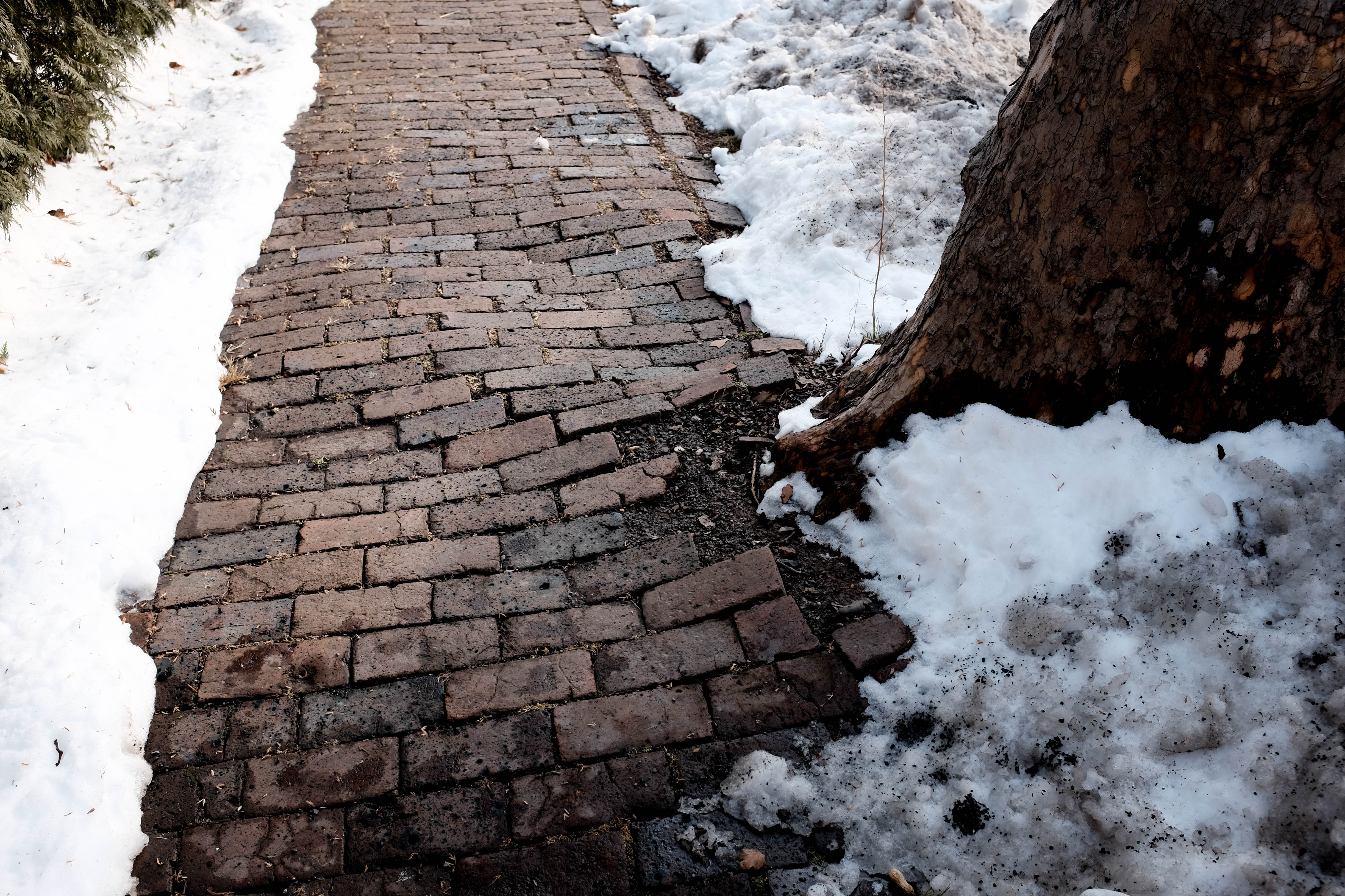 A winding brick path, uneven and cracked, meanders through a snowy landscape, evoking a sense of nostalgia and time's passage. The contrast between the dark bricks and the white snow enhances the mood of quiet solitude. Dappled light filters through nearby trees, casting gentle shadows that accentuate the path's irregularities.