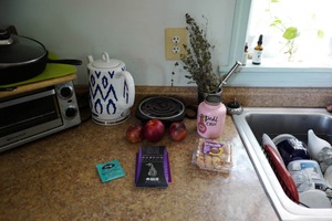This photograph captures a cozy kitchen scene filled with everyday objects: vibrant red apples, a handcrafted teapot, and assorted snacks, all arranged on a textured countertop. Natural light filters in from the window, casting a soft glow that enhances the warm, inviting atmosphere of this lived-in space. The subtle clutter and warm tones evoke a sense of comfort and daily life, inviting the viewer to pause and appreciate the simple beauty of home.