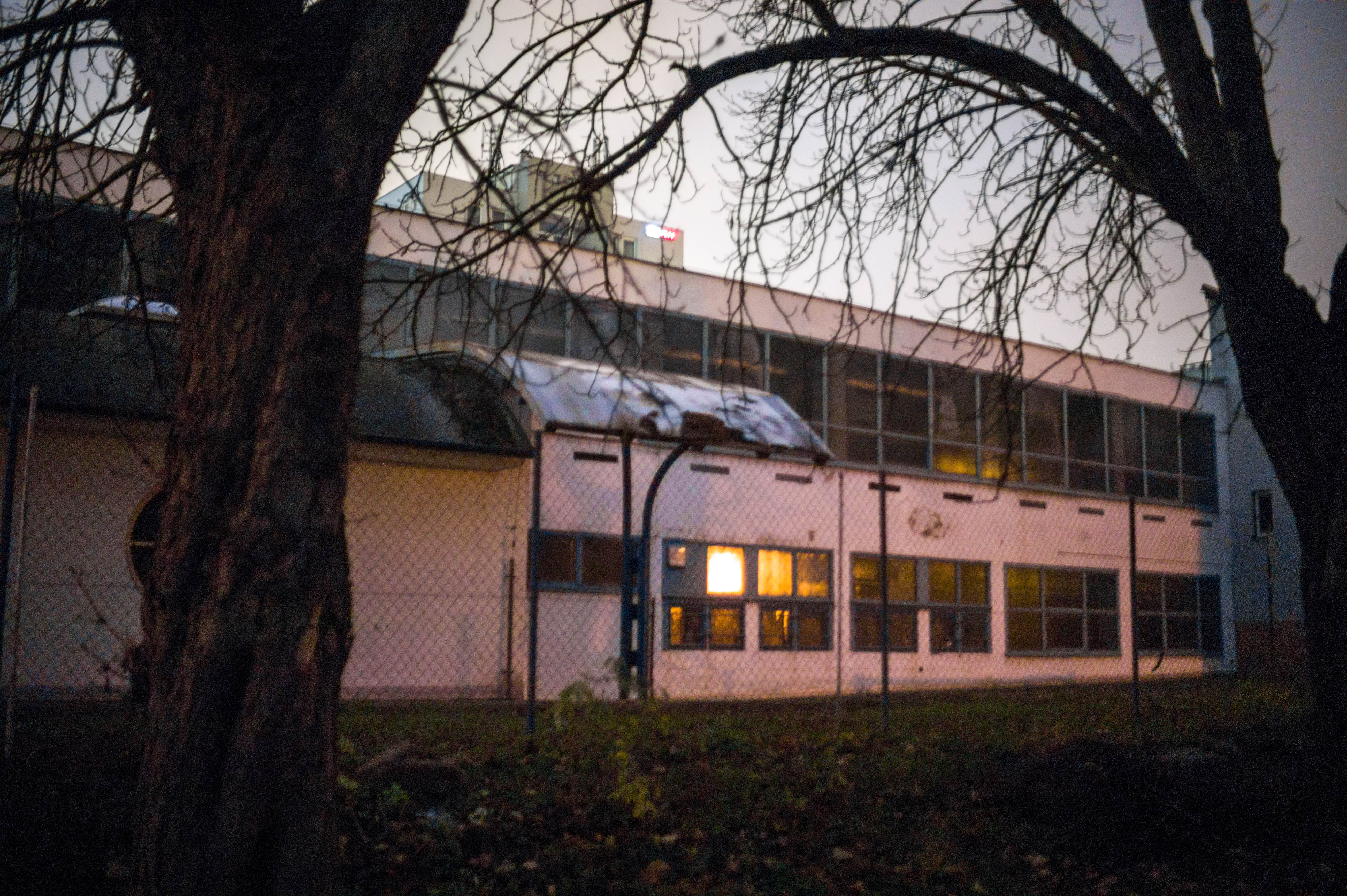 A dimly lit, abandoned building stands eerily against the twilight sky, its windows catching a flicker of warm light that contrasts with the cold setting. Stark silhouettes of bare tree branches frame the scene, enhancing the sense of isolation and decay. The mood is somber and reflective, evoking memories of forgotten places as shadows stretch across the ground.