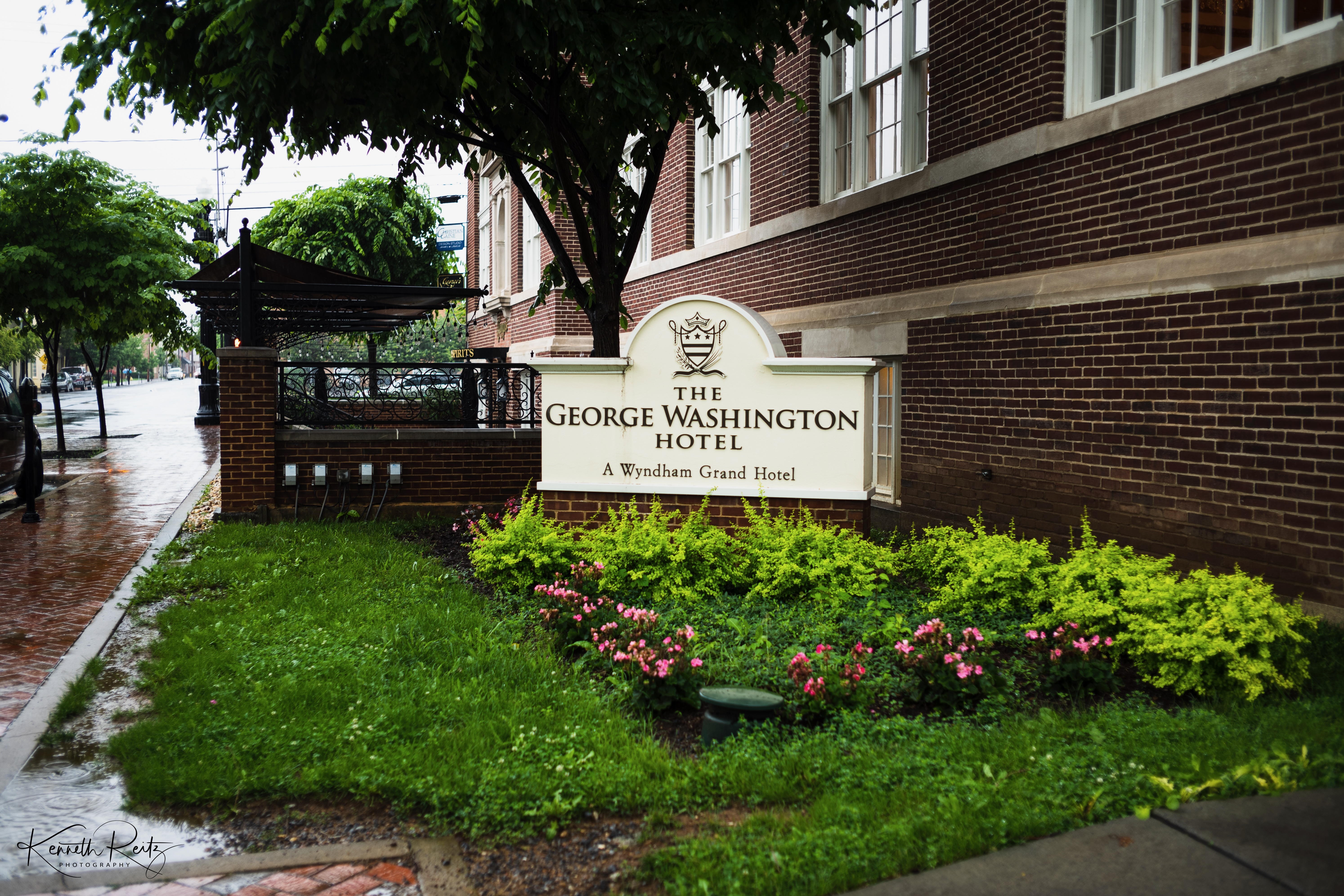 The photograph captures the elegant signage of the George Washington Hotel, framed by lush greenery and a rainy sidewalk. The muted, overcast light creates a serene mood, while the vibrant flowers add a touch of color to the scene. The composition hints at a blend of urban charm and refined hospitality, inviting passersby to step into its welcoming ambiance.